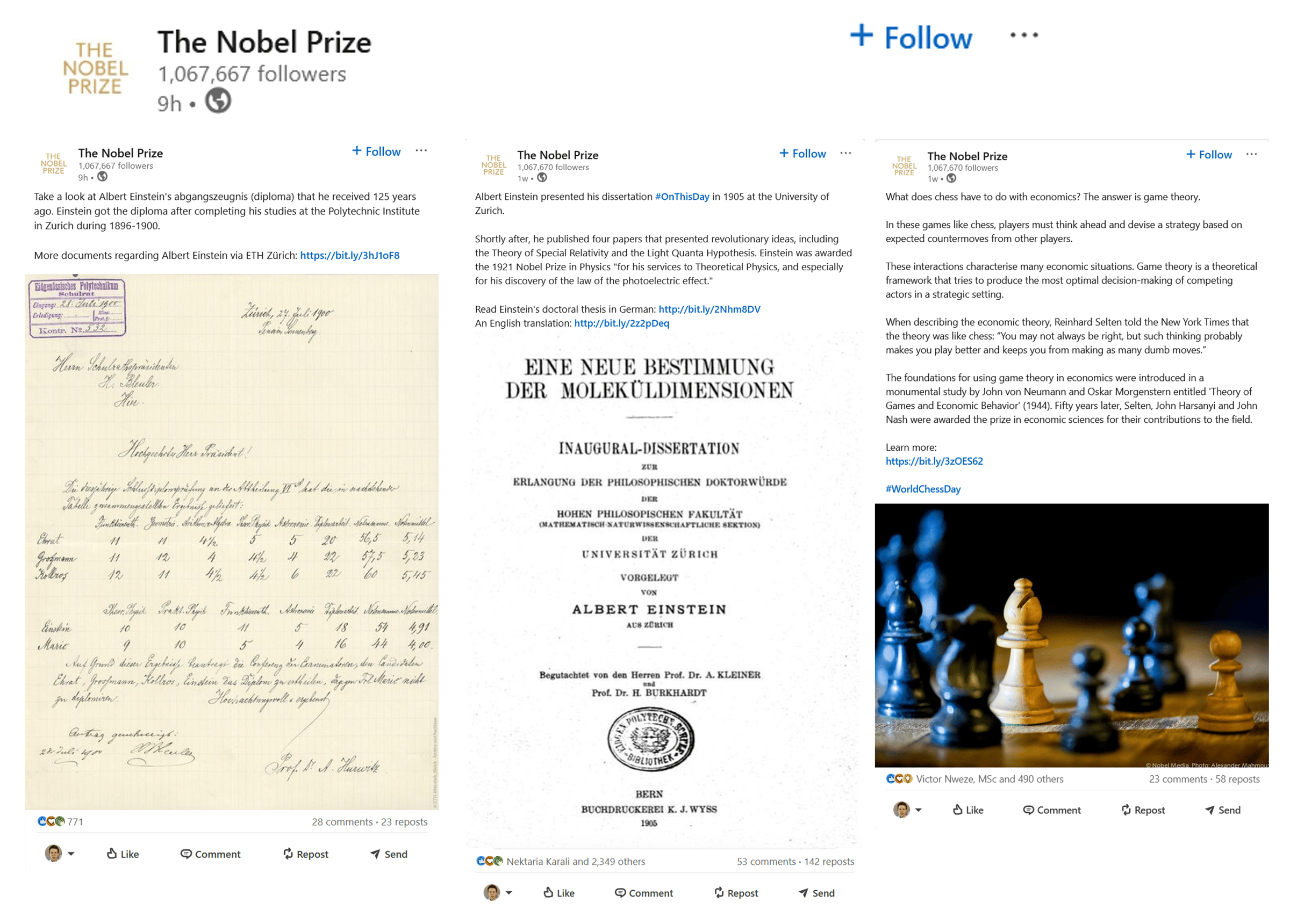 Tip: Click to enlarge. The Nobel Prize LinkedIn profile is the perfect example of large-channel advantages. Their posts have 771, 2,349, and 490 reactions—but no small channel could get away with their posts: generic or non-exciting thumbnails, unexciting or uninformative captions; hookless first lines, and including a link which typically kills reach. Although you could expect more with >1M followers, it’s probably still enough to maintain attention and grow the channel. Try doing the same as a small channel… and even after 3 years of posting, you likely won’t get anywhere. Of note, they also have cool posts like this one that fits this format.