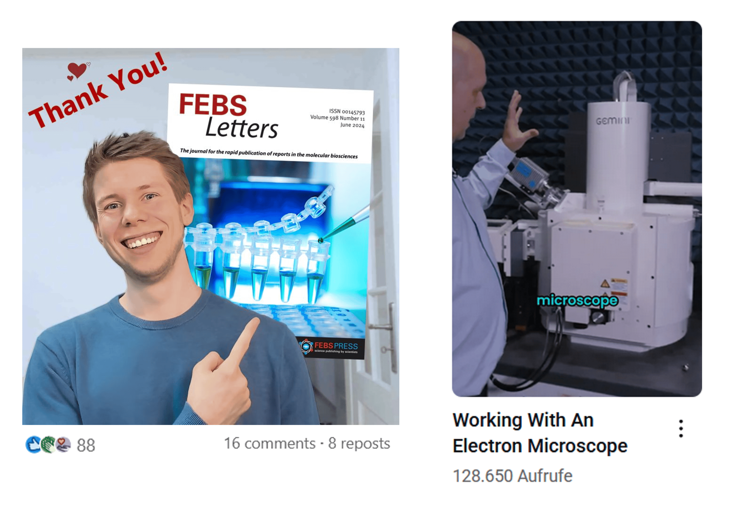 On the left, you see a thumbnail from one of my LinkedIn posts that I made quite a while ago. For these kinds of “accomplishment” posts on LinkedIn, showing yourself - or a group of people - works really well, no matter who you are. When it comes to YouTube, though, I’d argue you should only show a face prominently if it’s already well known. You can watch the YouTube Short here (it was my first successful one—and below, you’ll see its crazy stats).