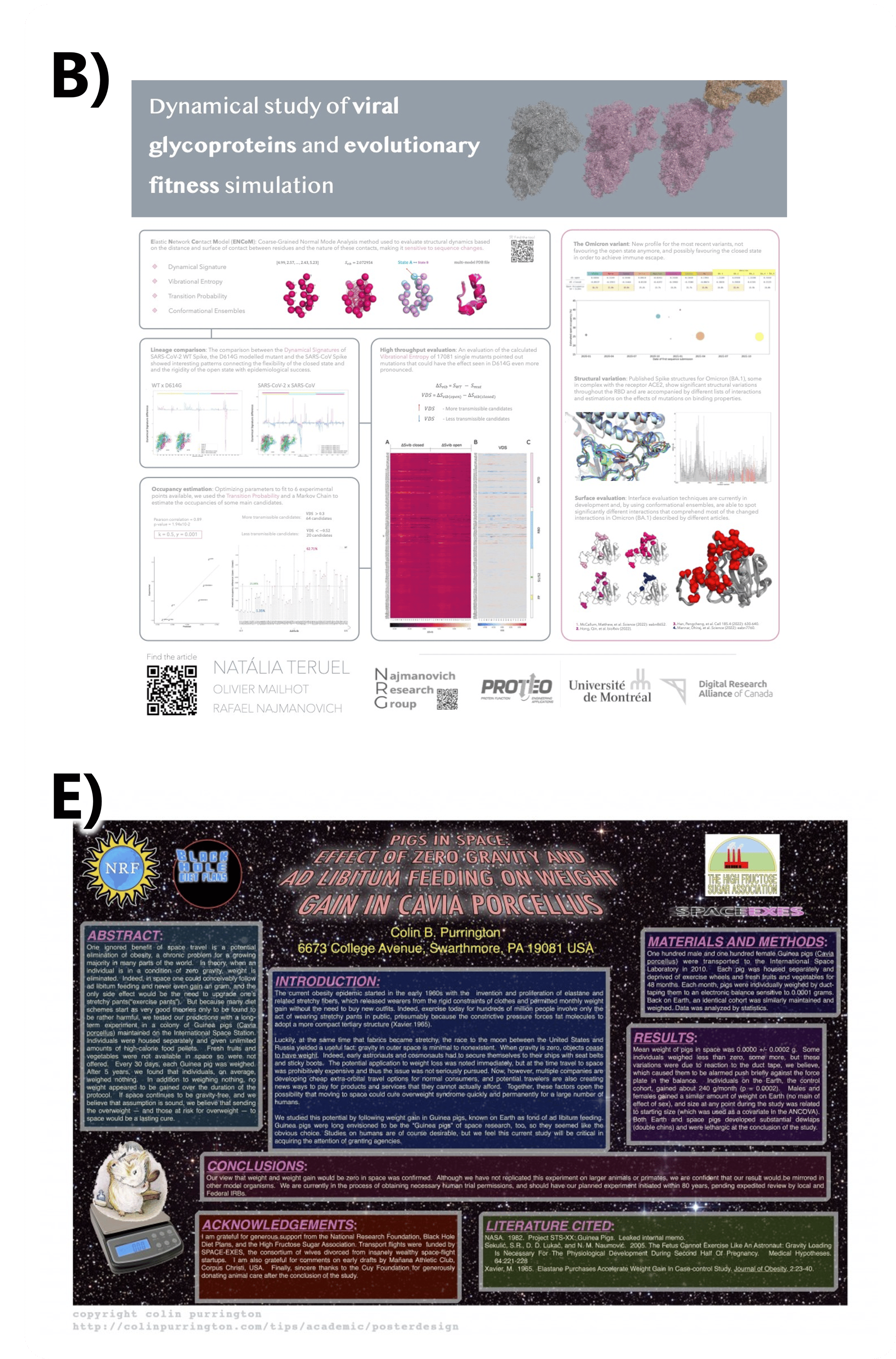 Click to enlarge. I think these are two examples of the motivations we discussed. With E), you have the Star Wars–like heading, and due to the background, few will notice that you just wanted to get the job done. With B), you not only communicate your results, but with the QR code at the bottom you also invite people to read more.