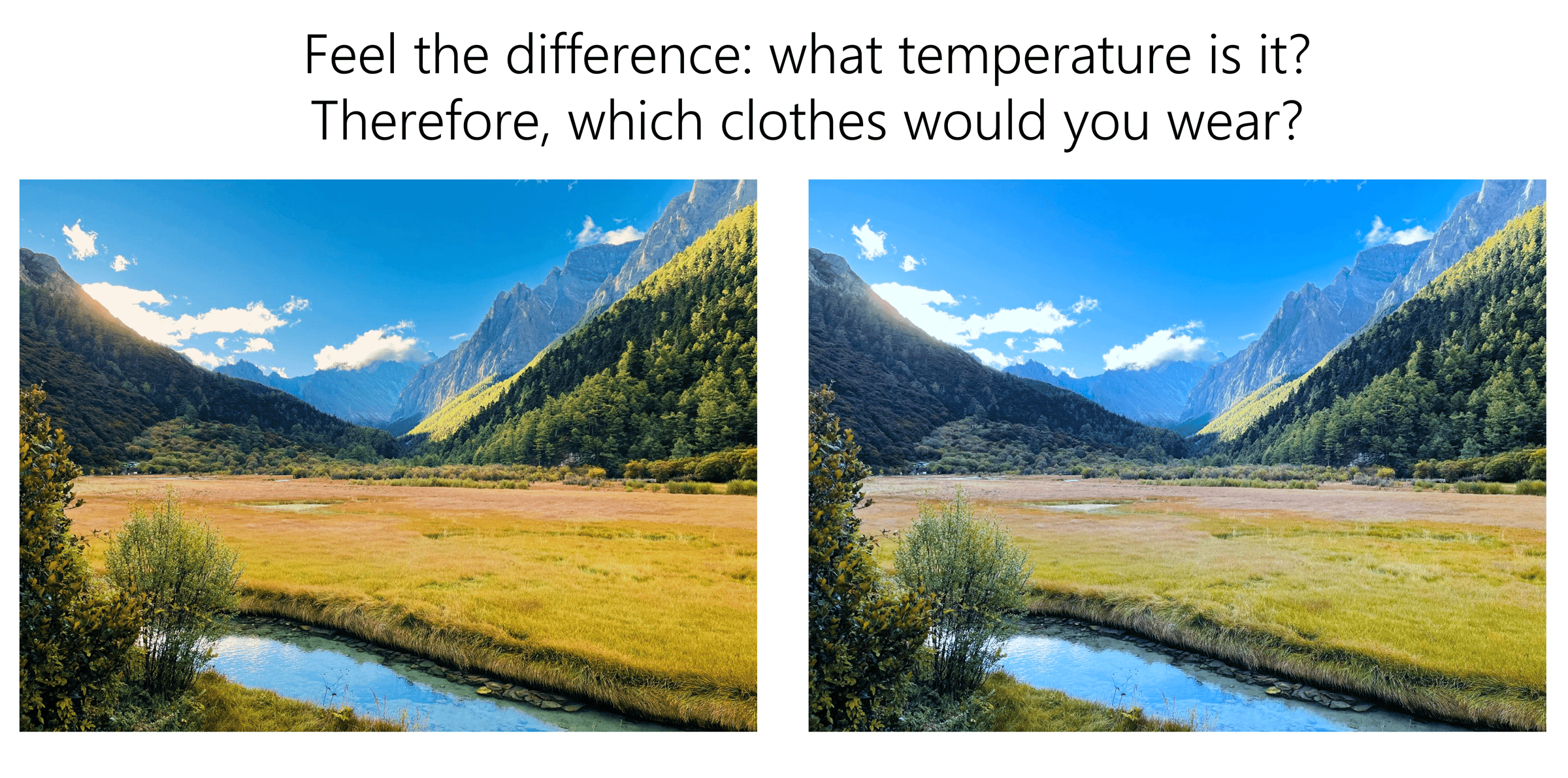 Same picture, different feelings—you might imagine jumping into the river with friends on the left, but going on a hike with gear on the right, don't you?